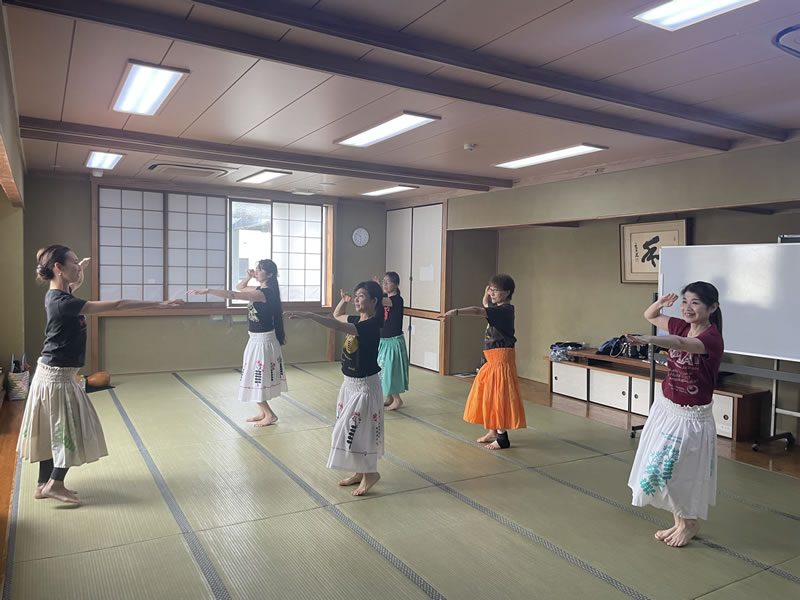 活動日にはまず腹式呼吸を行い、フラへ気持ちを作った後、基本のステップを丁寧に行い、曲の練習という流れで活動されています。